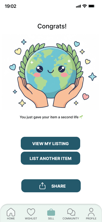 Features such as environmental impact indicators, personalized recommendations, and trust-building tools enhance an experience that turns everyday tasks into more conscious and rewarding decisions.